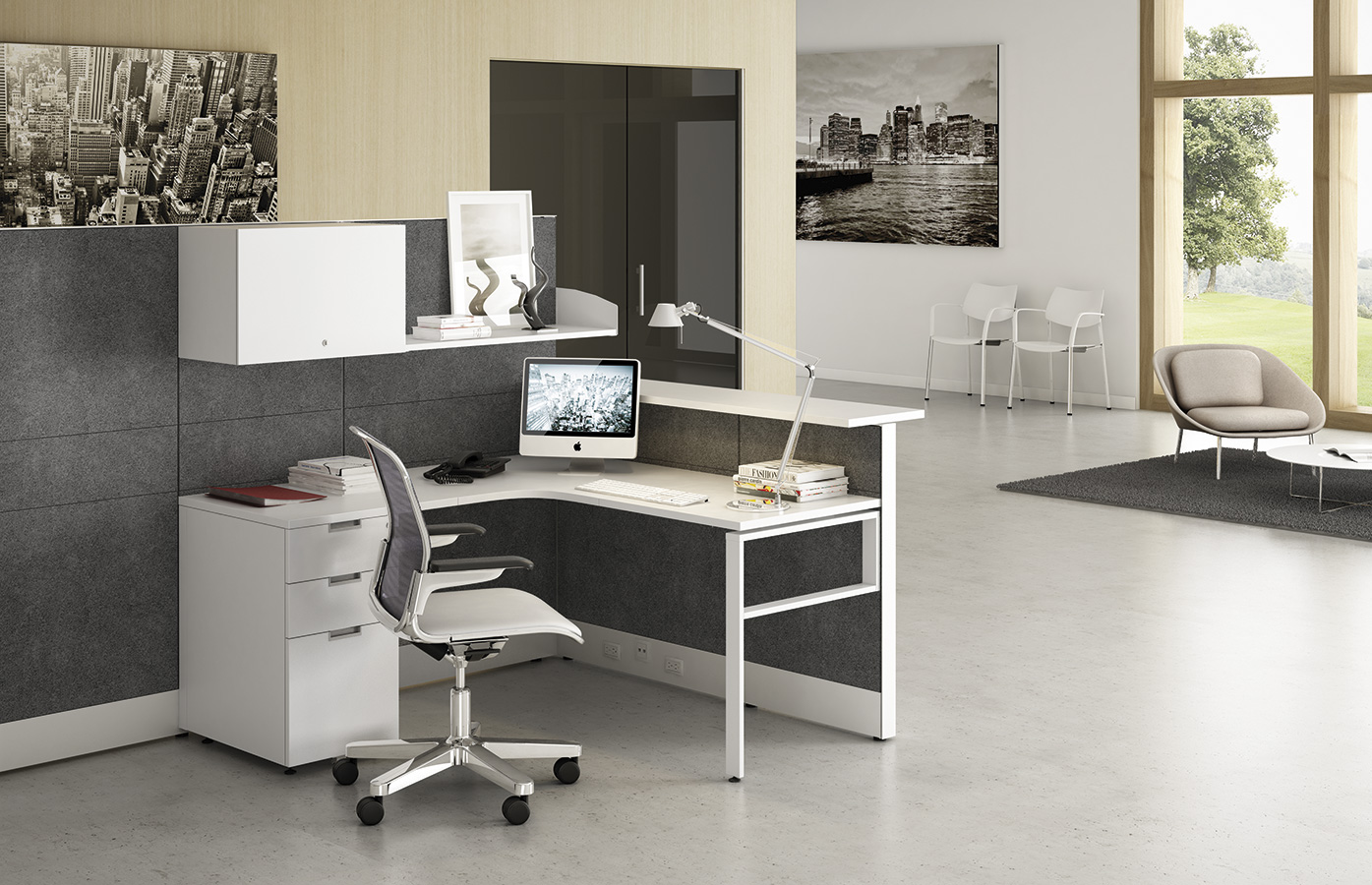 • Easy access to wire management through flip-up belt line tile at worksurface level.